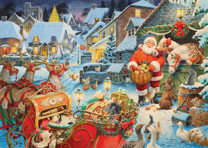 It’s Christmas eve and Santa is making his way through a snowy village, delivering the last few presents to the children on his list, when he spots a nearby stable with two ponies looking out. He parks his sleigh, reaches into the almost empty sack of toys, and pulls out some carrots that were intended for his reindeer. As he walks over to a nearby stable, he is suddenly greeted by cats, dogs, chickens, geese and even some robins come to see what is going on. Santa knew he couldn’t leave them out, so he shared the contents of his lunch dox with them all. Santa smiled as he watched them eat, happy to have made their night a little better. This wonderful puzzle is the perfect way to get into the Christmas mood! This is the 27th Limited Edition Christmas puzzle created by our UK based team.