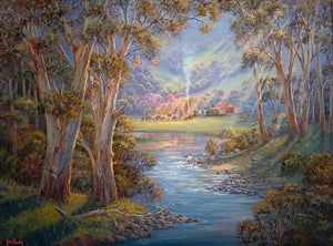 His subject matter ranges from the harsh outback regions to the verdant coastal scenery of the eastern states of Australia. John’s treatment of light on the trees and foliage is unique. The subtlety of colour in his majestic panoramic vistas of the Blue Mountains is awe inspiring.