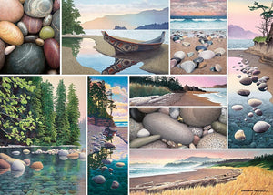 Relax into your personal puzzle nirvana with the quiet calm of this lovely collage! Illustrations of Canadas west coast highlight nature scenes ranging from breaking ocean waves to peaceful inlets and coves. The pastel palette extends to the rocks, smoothed by centuries of waves tumbling away rough edges. The sleek lines of the canoe are a result of steaming the hull to widen it.