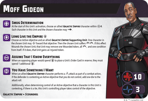 The Empire lives on this new Squad Pack for Star Wars™: Shatterpoint! This pack brings the cunning Moff Gideon to the game as a Primary Unit. He is joined by a Death Trooper Escort as a Secondary Unit and two terrifying Dark Troopers as a Supporting Unit. Together, they form an intimidating Galactic Civil War-era squad ready to be deployed. Alternatively, they can be combined with other units from this era to form a custom squad. Rounding out this pack are all the Stat, Stance, and Order cards players need to field them in battle.