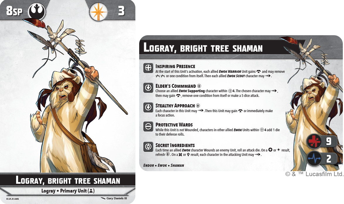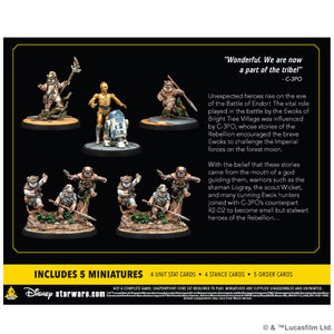 Unexpected heroes rise to join the battles of Star Wars™: Shatterpoint in this new pack! The Ewoks of Bright Tree Village played a vital role in the Rebellion's victory in the battle of Endor and this pack brings the Ewok shaman Logray into the game as a Primary Unit. He is joined by Wicket as a Secondary Unit and two Ewok Trappers wielding spears as a Supporting Unit. Rounding out the pack are R2-D2 and C-3PO, who join together to form another Secondary Unit option. In addition to miniatures of these characters, this pack also includes all the Stat, Order, and Stance cards players need to add these characters to their squads.