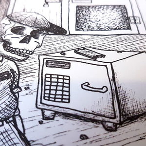 Puzzle cards are an escape room-type experience in a greeting card. The scene illustrated within the card presents you with a series of written, visual, and abstract clues. These clues will need to be found and pieced together to solve the puzzle and “escape the video store”. The solution to the puzzle is a codeword.