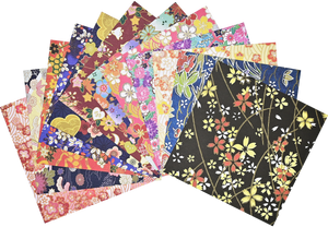 - 12 different Japanese washi designs are featured on one side of each sheet, with brilliant solid colors on the other side.