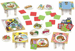 Contents:4 x 3D tables, 1 x spinner, 1 x till board, 1 x tray board, 16 x meal/beverage/snack cards, 32 x money cards (16 easy cards, 16 hard cards)