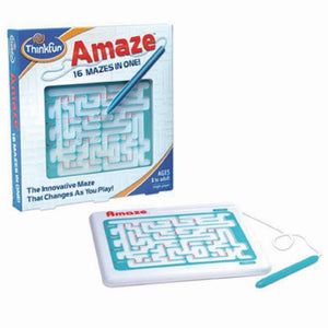 A maze that changes every time you play! Navigate through the maze with the attached stylus, pushing open movable gateways while avoiding traps and dead ends! An innovative twist on a classic maze puzzle, Amazes diabolical shifting pathways change the solution path during play! With 16 unique challenges and no pieces to lose, Amaze is the ideal travel game!