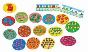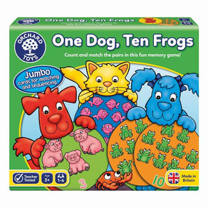 Count and match the pairs in this fun memory game! Teach number sequencing Learn numbers up to 15! Single person activity or multi-player game A giant floor activity, counting and memory game, with supersize cards for even more fun and play value! These include a variety of friendly characters to pair and count, helping children learn to count up to the 15 with the help of the handy reference board. To play, players take turns to pick up a card and count the characters before picking up a second card and counting the characters on the second card. If both cards match the player gets to keep them; if not they are placed back on the floor face down and play passes on to the next player. Players can then use their memory skills to match the cards. Play continues until all the cards have been paired. Once all the cards have been paired, players can then use the number reference board to help make a jumbo number line with their supersize cards. One Dog, Ten Frogs can be played as a single person pairing activity or a multi-player game. Contents: 30 jumbo pairs cards 1 number reference board 1 instruction leaflet