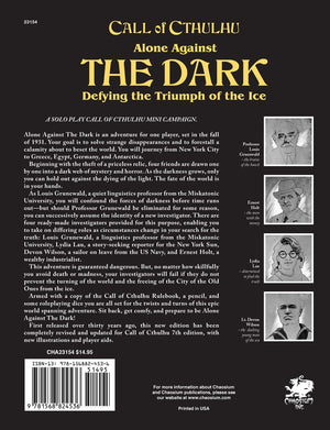 Alone Against The Dark is an adventure for one player, set in the fall of 1931. Your goal is to solve strange disappearances and to forestall a calamity about to beset the world. You will journey from New York City to Greece, Egypt, Germany, and Antarctica.