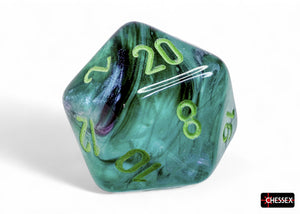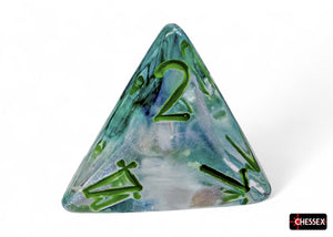 This set contains 7 Borealis Kelp dice with light green numbers with the following shapes:
