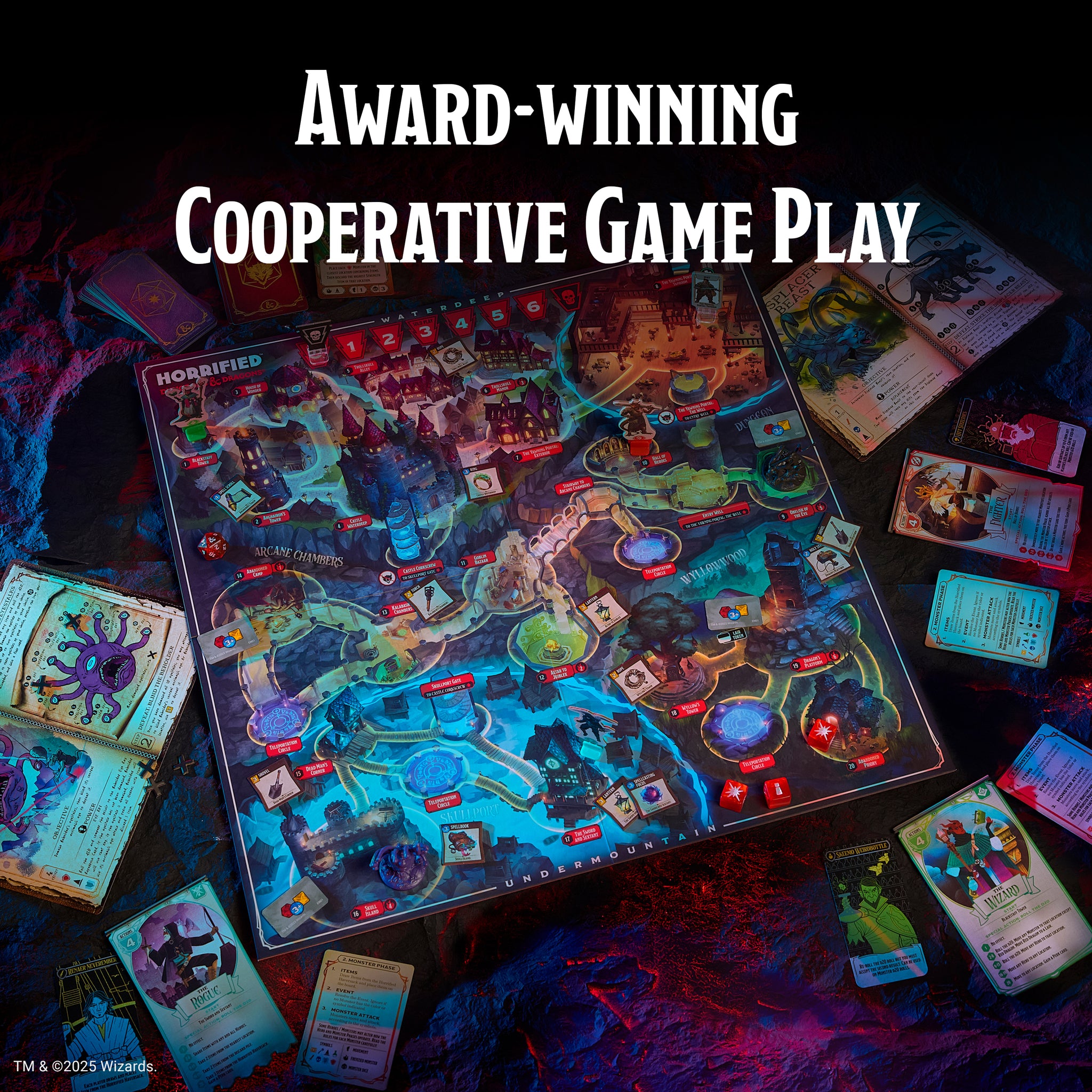 Finally, the iconic monsters of Dungeons & Dragons meet the award-winning Horrified board game. Cooperate with your friends to complete unique challenges inspired by 4 iconic D&D monsters, all while dodging attacks and saving other adventurers! Compatible with Horrified: Greek Monsters and World of Monsters.