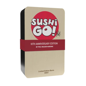 Sushi Go! 10th Anniversary Edition features the Sushi Go! base game in a numbered limited edition, with the box containing a sushi boat leader marker, wasabi scoring markers, and four packs of dessert cards that can be used instead of the usual strawberry pudding.