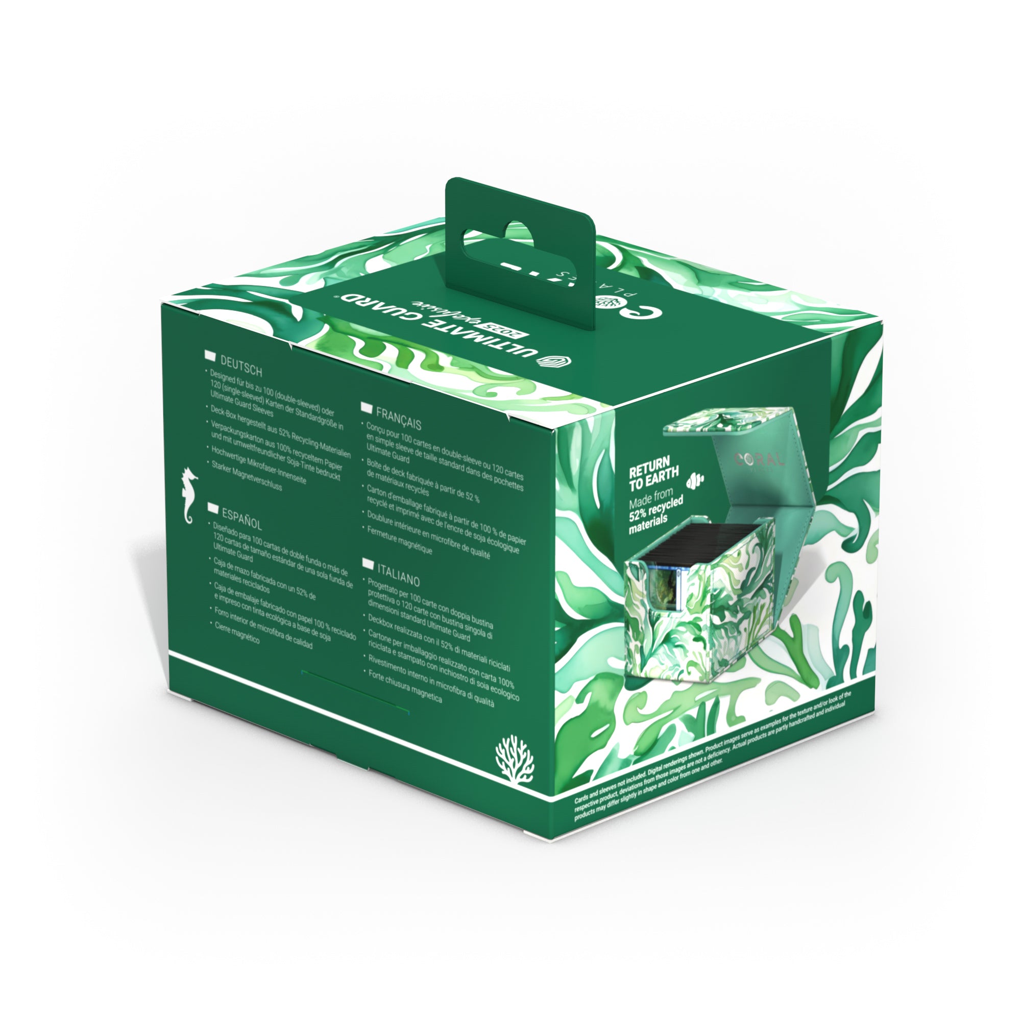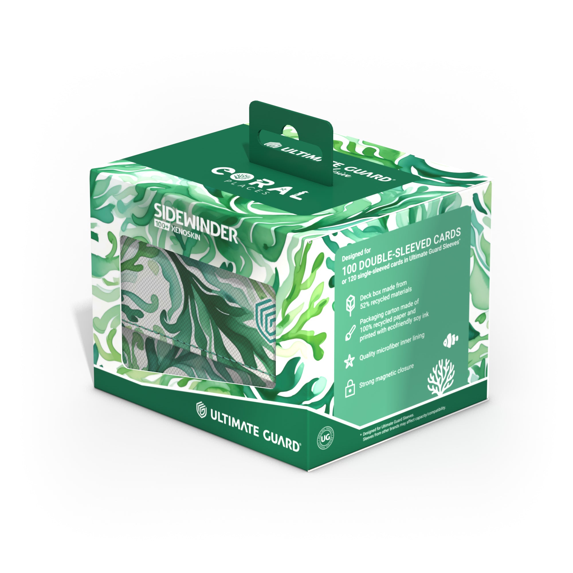 Dive into flourishing underwater worlds with the 2025 Exclusive Sidewinders from Ultimate Guard! The sustainable Coral Places deck boxes are made from 52% recycled materials and, in addition to the durable Xenoskin surface, have a strong magnetic closure and a high-quality microfibre inner lining so that up to 100 (double-sleeved) or 120 (single-sleeved) cards from games such as Magic: The Gathering, Pokémon, Lorcana, One Piece or Yu-Gi-Oh! can be stored safely. The plastic-free packaging is also made entirely from recycled paper and cellulose-based film.