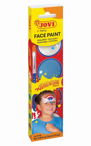 ADVENTURE Set of 3 jars of 8ml cream face paint in white, red, and light blue colors. It includes a face paint sponge and a flat brush