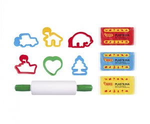 SUPER KIT Set Modelling clay 3 bars 50 gr + 6 cutters + 1 roller pin