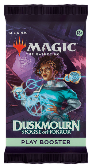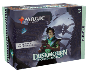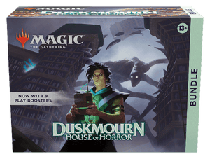 When you’re trapped in the endless halls of Duskmourn, the only way out is through. Band together with plucky survivors and battle your way to the heart of the House. This Duskmourn: House of Horror Bundle contains 9 Duskmourn: House of Horror Play Boosters, plus 1 Traditional Foil card with Bundle-exclusive alternate-art, 15 Traditional Foil and 15 nonfoil Land cards (including 5 foil and 5 nonfoil Full-Art Lands), 1 oversized Spindown life counter, 1 card storage box, and 2 reference cards. Each Play Booster contains 14 Magic: The Gathering cards, including 1–4 cards of rarity Rare or higher and at least 1 Traditional Foil card.