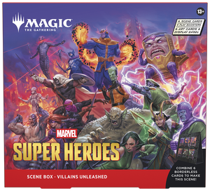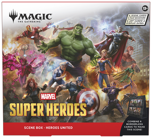 Immortalize epic conflicts with a Magic: The Gathering | Marvel Super Heroes Scene Box. Power up your deck or collection with six traditional foil borderless scene cards. While each scene card is a playable Magic card (including game text), this box also contains six art-only cards that allow you to appreciate the scene in all its glory and display it on the included easel! Each Scene Box comes with three Play Boosters; the best way to discover what Magic has to offer, they're perfect for building decks, playing games with friends, and are tons of fun to open.