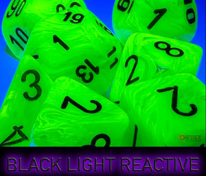 Contains 7 Vortex Bright Green Dice with black numbers in the following Shapes: