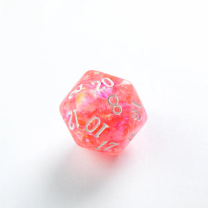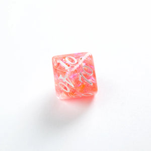 Choose your weapon! This dice set contains a D4, a D6, a D8, two D10 (10 and 00), a D12 and a D20. All dice are round-cornered and manufactured at a premium level. The Candy dice are infused with beautiful glitter flakes. They are packed in a window cardboard box that displays all dice at the front.