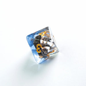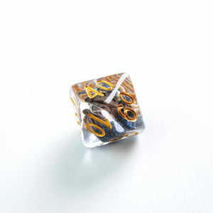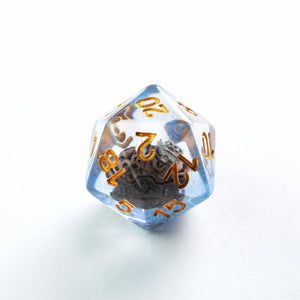 Choose your weapon! This dice set contains a D4, a D6, a D8, two D10 (10 and 00), a D12 and a D20. All dice are round-cornered and manufactured at a premium level. The Embraced Dice have an interesting item inside the cube and will make your game night a critical hit. They are packed in a window cardboard box that displays all dice at the front.