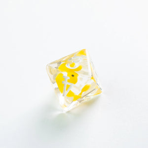 Choose your weapon! This dice set contains a D4, a D6, a D8, two D10 (10 and 00), a D12 and a D20. All dice are round-cornered and manufactured at a premium level. The Embraced Dice have an interesting item inside the cube and will make your game night a critical hit. They are packed in a window cardboard box that displays all dice at the front.