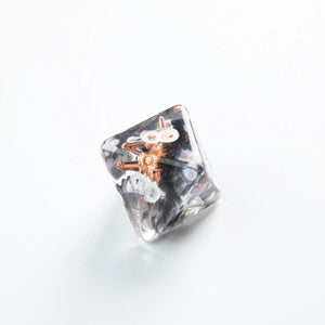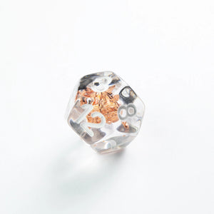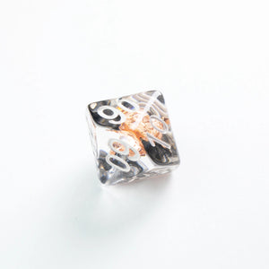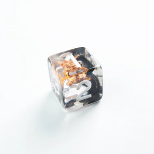 Choose your weapon! This dice set contains a D4, a D6, a D8, two D10 (10 and 00), a D12 and a D20. All dice are round-cornered and manufactured at a premium level. The Embraced Dice have an interesting item inside the cube and will make your game night a critical hit. They are packed in a window cardboard box that displays all dice at the front.