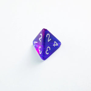 Choose your weapon! This dice set contains a D4, a D6, a D8, two D10 (10 and 00), a D12 and a D20. All dice are round-cornered and manufactured at a premium level. The Galaxy range is the exciting fusion of two or more cosmic colours, creating unique looks with the addition of glittering elements. They are packed in a window cardboard box that displays all dice at the front.