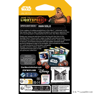 Enter a galaxy of endless possibilities in Star Wars™: Unlimited! In this fast-paced, easy-to-learn trading card game, you and your opponent face off in exciting head-to-head battles full of iconic Star Wars characters. Ready your resources and shoot from the hip with Han Solo with a Spotlight Deck! This pre-built, ready-to-play 50-card deck provides everything you need to dive into the game’s fourth set, Jump to Lightspeed.