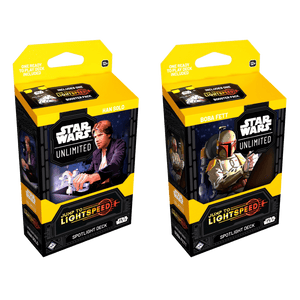 Enter a galaxy of endless possibilities in Star Wars™: Unlimited! In this fast-paced, easy-to-learn trading card game, you and your opponent face off in exciting head-to-head battles full of iconic Star Wars characters. Ready your resources and shoot from the hip with Han Solo or dish out extra damage to the enemy forces with Boba Fett with a Spotlight Deck! This pre-built, ready-to-play 50-card deck provides everything you need to dive into the game’s fourth set, Jump to Lightspeed.