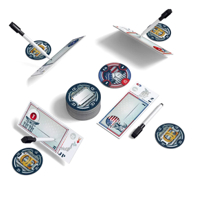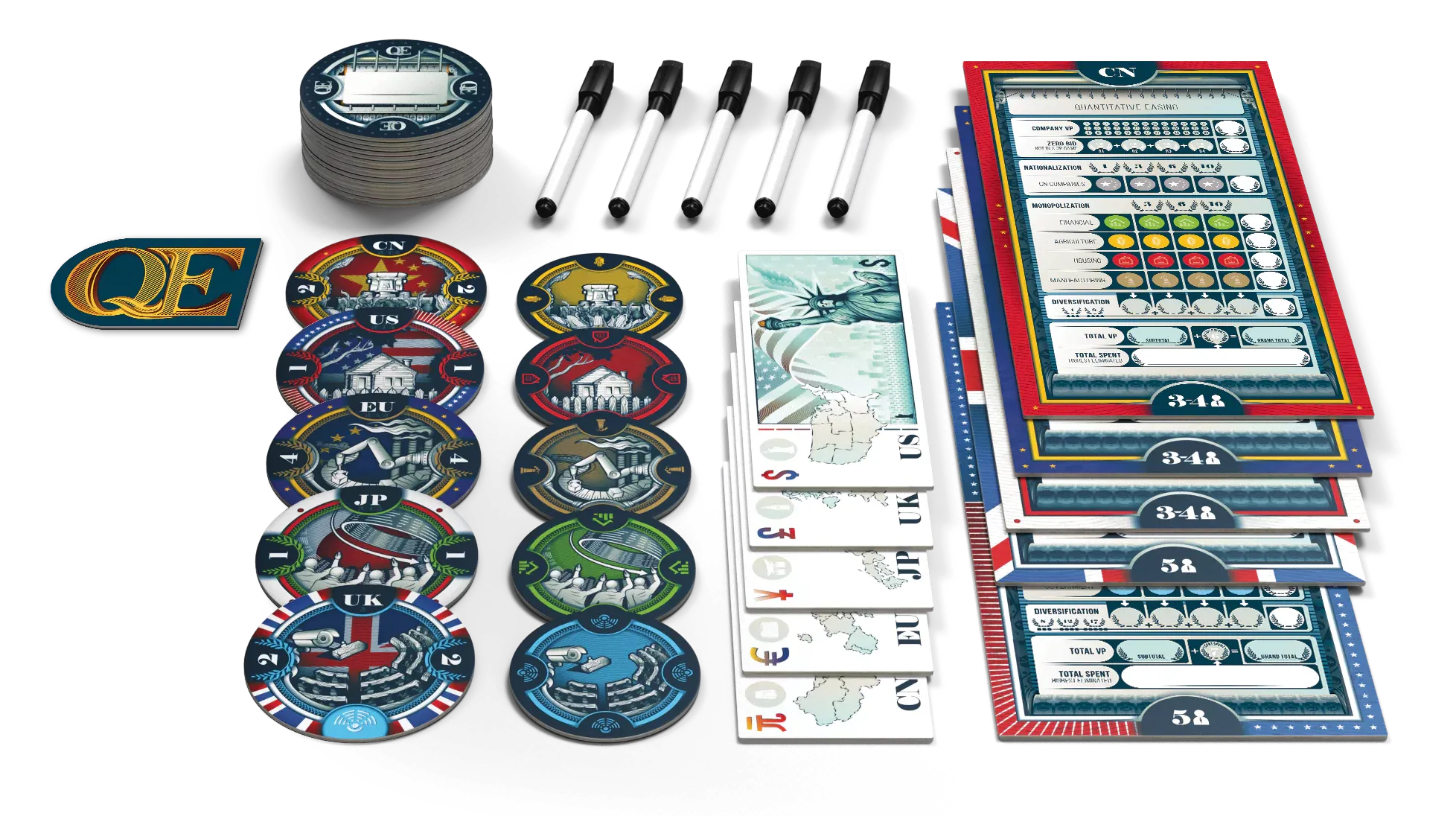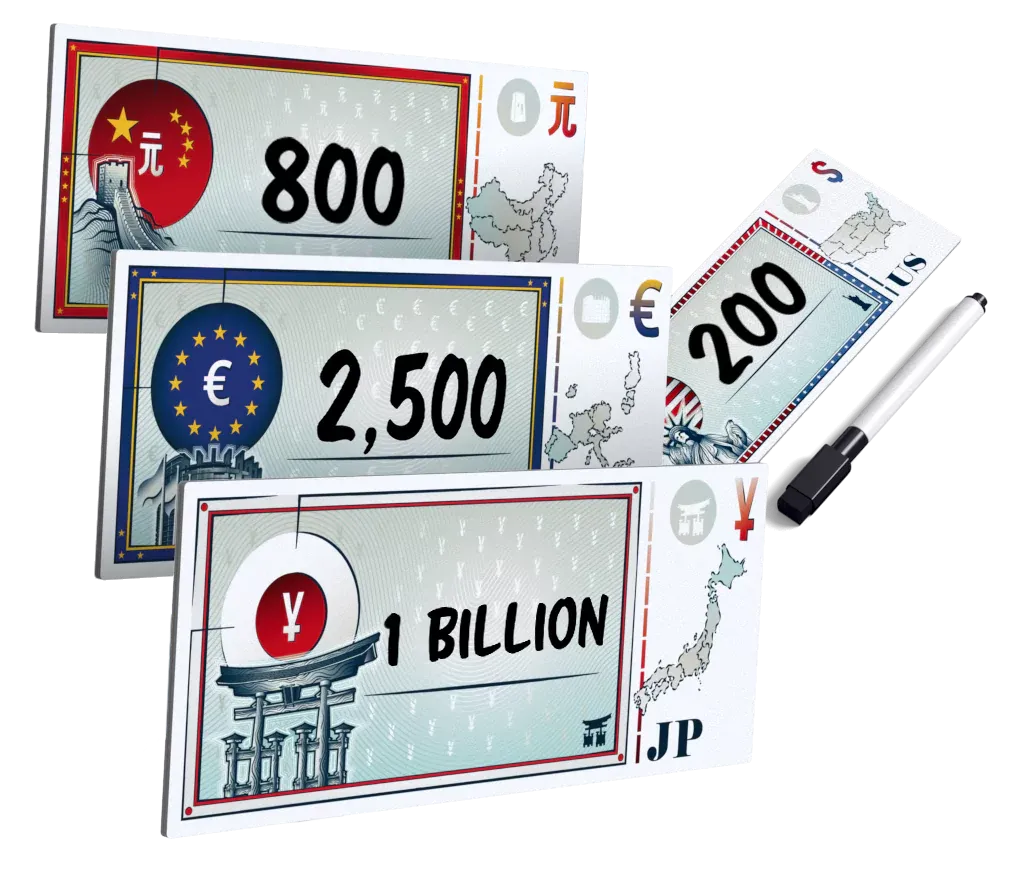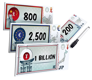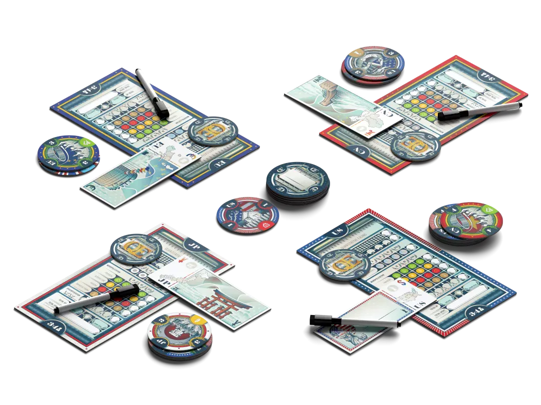 At the end of the game, total up all your winning bids by the amount of companies and special bonus points. Whoever has the most points wins. But be careful though - if you are the country who spends the most during the game, you’re out! It's a super interactive experience that turns auction gaming on its head.