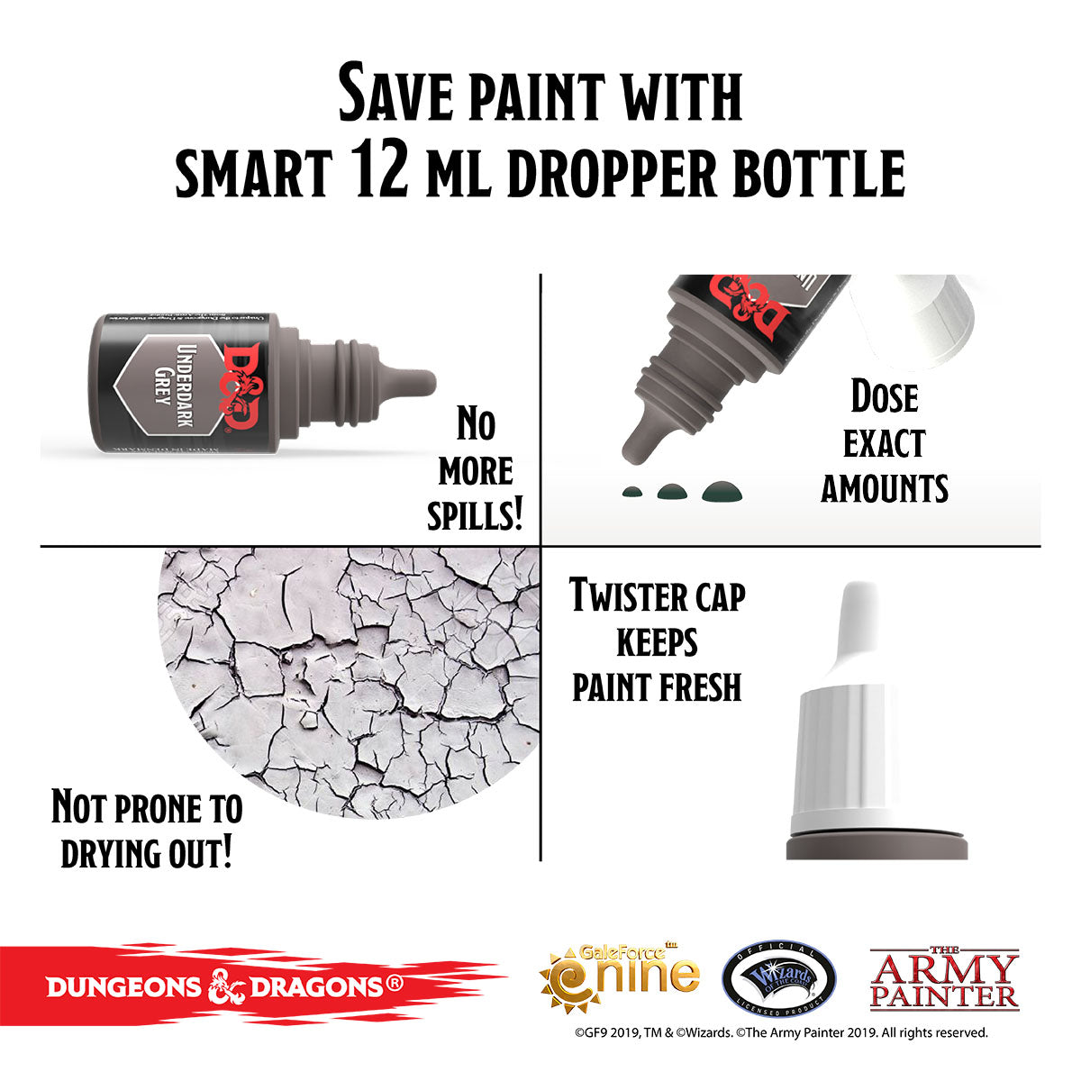 This official Dungeons & Dragons set of Marvelous Pigments will offer you a perfect palette to painting the many and varied monsters from the Monster Manual™ and it comes with a free, and exclusive Owlbear miniature to get you started. The paint comes in 12ml dropper bottles, enable you to administer the exact amounts of paint you need – and afterwards store them easily, so they do not dry out.