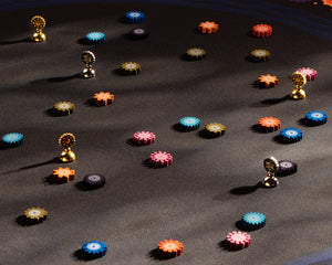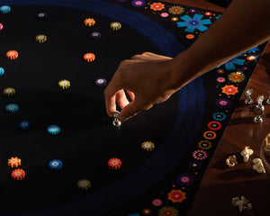 Lacuna is a game for 2 players about collecting flowers on a pond at night. Draw an imaginary line between two flowers, place your pawn, and collect both flowers. Win by collecting the most flowers in the most colors!