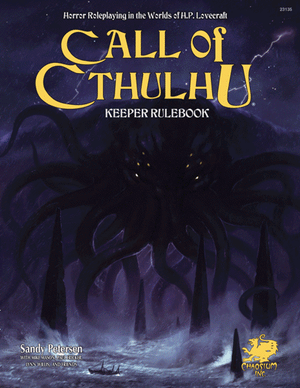 Call of Cthulhu is a tabletop roleplaying game based upon the worlds of H. P. Lovecraft. It is a game of secrets, mysteries, and horror. Playing the role of steadfast investigators, you travel to strange and dangerous places, uncover foul plots, and stand against the terrors of the Cthulhu Mythos. You encounter sanity-blasting entities, monsters, and insane cultists. Within strange and forgotten tomes of lore you discover revelations that man was not meant to know. You and your companions may very well decide the fate of the world.