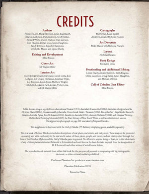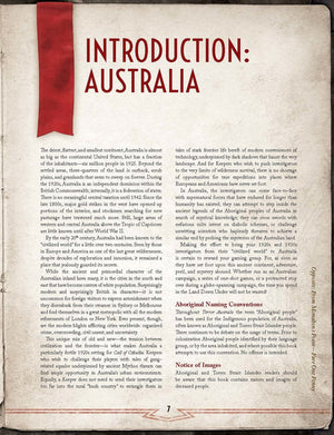 In Australia, investigators will come face-to-face with supernatural forces that have endured for longer than humanity has existed. It is a land of adventure, danger, and ageless wisdom—a perfect for setting for Call of Cthulhu! Whether run as an Australian campaign, a series of one-shot games, or a protracted stop over during a globe-spanning campaign, the time spent in the Land Down Under will not be wasted!