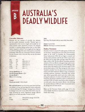 Gathered in the appendices are some of Australia’s deadly wildlife, with game profiles provided for their use in games, as well as timelines covering Australia, and recommended further reading and viewing.