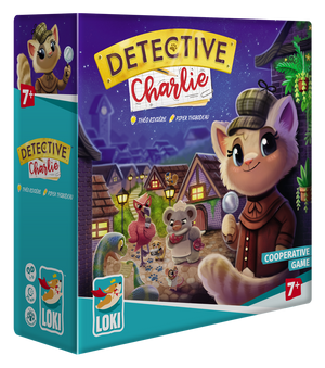 Detective Charlie is a cooperative game. Each player takes turns moving Detective Charlie with the die and interrogating witnesses.