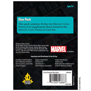 'Marvel: Crisis Protocol' is a tabletop hobby miniatures game set in the Marvel Universe. Players assemble, paint, and collect an ever expanding line of highly detailed plastic miniatures representing iconic Marvel characters. Players choose characters from their collections to form their own Marvel inspired dream team and then pit their chosen forces against each other on an interactive tabletop where the very terrain itself can be thrown, crashed into, and destroyed during the super powered showdown. This pack contains 10 dice for Marvel: Crisis Protocol to supplement those found in the Marvel: Crisis Protocol Core Set