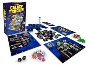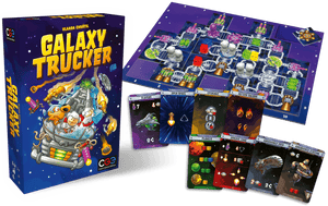 In the fast and goofy family game Galaxy Trucker, players begin by simultaneously rummaging through the common warehouse, frantically trying to grab the most useful component tiles to build their spaceship — all in real-time. Once the ships are launched, players encounter dangerous situations while vying for financial opportunities, each hoping to gain the most valuable cargo and finish with as much of their ship still intact as possible. Of course, that's easier said than done since many hazards will send pieces of your ship, your cargo, and your crew hurling into the depths of space. The goal is to survive the trek — hopefully with at least some of your crew and ship intact — and have at least one credit by the end of the game. (Profit, yay!) Players earn credits by delivering goods, defeating pirates, having the best-looking ship, and reaching their destination before the others. This version of Galaxy Trucker is a relaunch of the original 2007 release by Vlaada Chvátil that features new art, more ship tiles, tweaked card effects, and streamlined gameplay that consists of only a single flight through space. That said, should you want a longer, more challenging experience, you can play a three-flight campaign known as the "Transgalactic Trek".