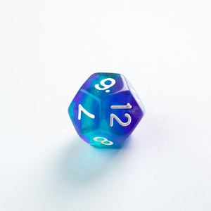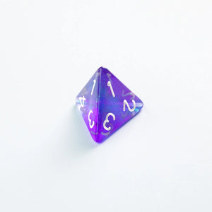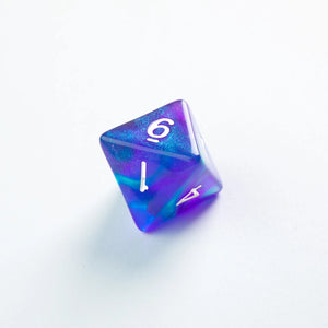 Choose your weapon! This dice set contains a D4, a D6, a D8, two D10 (10 and 00), a D12 and a D20. All dice are round-cornered and manufactured at a premium level. The Galaxy range is the exciting fusion of two or more cosmic colours, creating unique looks with the addition of glittering elements. They are packed in a window cardboard box that displays all dice at the front.