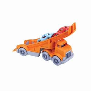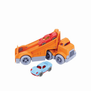 It’s off to the races with the Green Toys Racing Truck! The 3 piece set includes a bright orange Racing Truck and 2 Stack & Link Racers. The pocket-sized racers are the perfect size babies and toddlers, but are filled with fun for any age. The unique design allows for the cars to be used individually, stacked together, or linked in a chain. Each car also sports unique texture detailing for tactile stimulation. Hook the racers to the back of the Racing Truck’s extendable ramp, and when ready, release the car (or cars!) to zoom down! With no metal axels or small parts, the set is great for both indoor and outdoor play, and encourages motor skill development and imaginative, creative play.