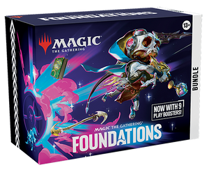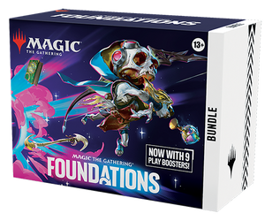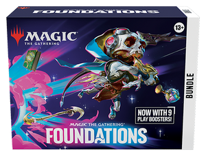 The best time to play your first Magic game is now. Dive into Foundations to create and share your quintessential Magic: The Gathering experience playing with and collecting cards selected to give every player the advantage. In this Bundle you’ll find 9 Foundations Play Boosters (each containing 14 cards), plus 1 Traditional Foil card with Bundle-exclusive alternate art, 20 Traditional Foil Basic Land cards (10 with Full Art), 20 nonfoil Lands (10 with Full Art), 1 oversized Spindown life counter, 1 Foundations card storage box, and 2 reference cards.