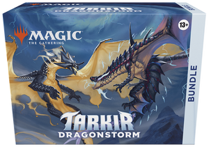 Master the fearsome Dragonstorms and summon dragons of your own to rain down fiery devastation with a box full of Tarkir: Dragonstorm cards and exclusive accessories. This Bundle contains 9 Tarkir: Dragonstorm Play Boosters, plus 1 Traditional Foil card with Bundle-exclusive alternate-art, 15 Traditional Foil and 15 nonfoil Land cards, 1 oversized Spindown life counter, 1 card storage box, and 2 reference cards. Each Play Booster contains 14 Magic: The Gathering cards, including 1–4 cards of rarity Rare or higher and at least 1 Traditional Foil card.