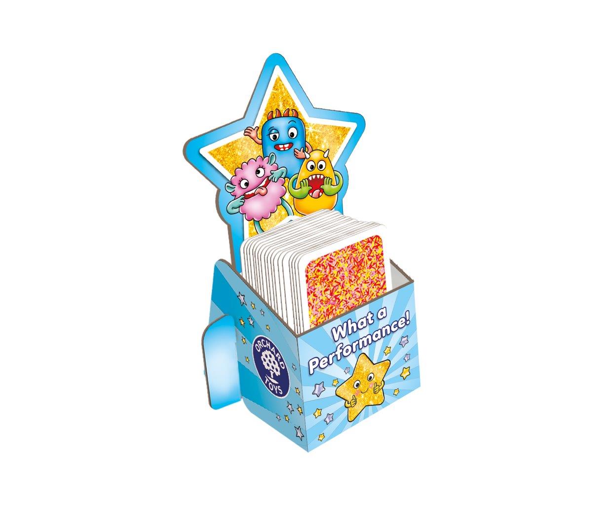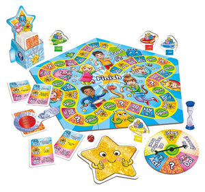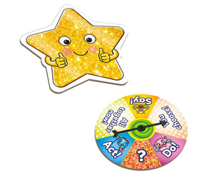 Be a star and rise to the challenge of this exciting family board game! Race your way around the performance board to be the first player or team to reach the finish, with lots of un noises, actions and activities along the way! Can you pretend to be a monkey, make a noise like a firework or wiggle your ears? If you can't, use the magic decoder and reveal your hidden forfeit on the back of the cards!