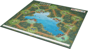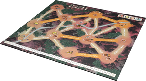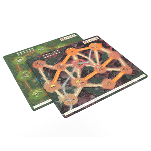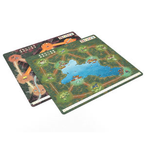 A deluxe double-sided playmat of the mountain and lake game boards from Root: The Underground Expansion.