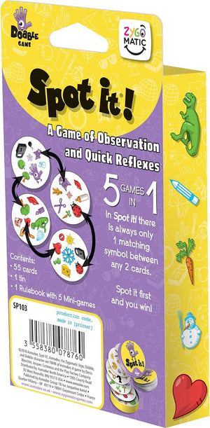 Test your observational skills and hone your reflexes with the award-winning gameplay of Spot It!, a game of lightning-fast choices for a group of two to eight players. With dozens of awards and possible versions married to elegant gameplay, Spot It! has become a global phenomenon. The game functions on a simple mechanic—fifty-five circular cards, each of which features a number of symbols and has exactly one of those symbols in common with every other card in the deck. With five distinct mini-games, you can be sure that Spot It! will be different every time you play, and because it’s always your turn, there’s never any downtime!